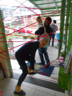 Disponibilizamos as famílias um momento de brincadeiras ao vir buscar seus filhos na escola. Logo ao chegar, os pais foram desafiados a passar por uma teia de gato, elaborada com elásticos.