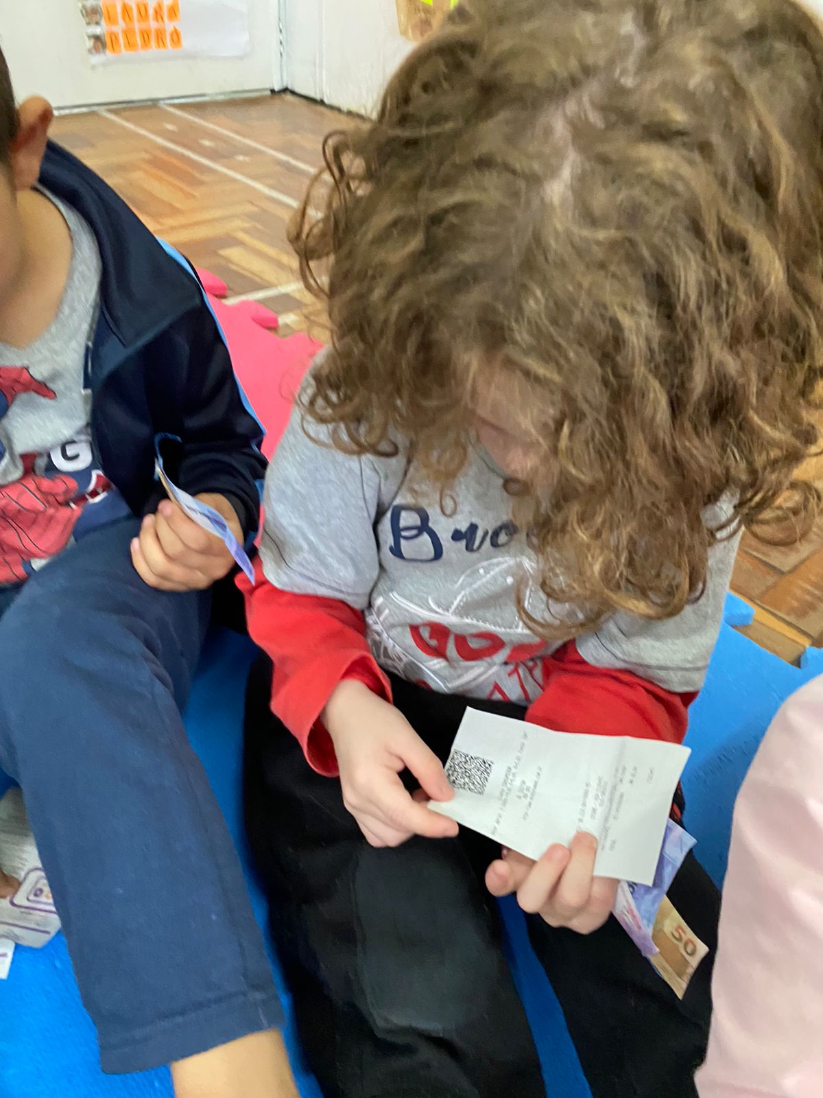 Na última semana, a turma do Pré1-A trabalhou sobre Educação Fiscal e Financeira. Conversamos para que serve o dinheiro, conhecemos os valores das notas e moedas do Real, nossa moeda, além de conhecer a nota fiscal e entender para que ela serve.